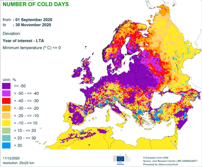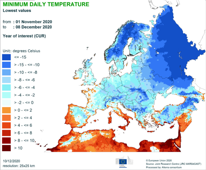 Вторжение холодного воздуха в восточную и юго-восточную Европу в конце ноября и начале декабря привело к падению минимальных температур до уровня ниже -15 ° C локально в северной и центральной Румынии, северной Скандинавии и на обширной части европейской территории России (в Приволжском округе, даже ниже -20 ° C). Согласно модели MARS, случаи вымерзания, скорее всего, имели место в Приволжском округе (а точнее, в Оренбургской области) как следствие недостаточной морозостойкости сельскохозяйственных культур. Ожидается, что более локализованные и небольшие случаи вымерзания произошли на севере Румынии.