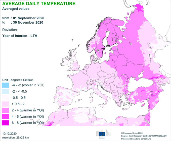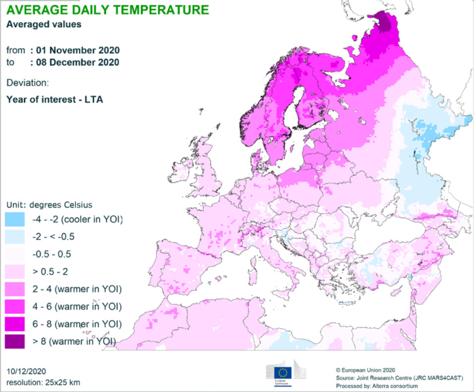 В течение обозреваемого периода (с 1 ноября по 8 декабря) в большей части Европы погодные условия были теплее, чем обычно. Если рассматривать этот период в целом, наиболее выраженные температурные аномалии наблюдались в регионах, окружающих Балтийское море, на Скандинавском полуострове и северо-западе России. В большинстве остальных частей Европы большой температурный избыток ноября — второго среди самых теплых за всю историю наблюдений — был частично компенсирован более холодными, чем обычно, условиями в начале декабря. Осень в целом была самой теплой за всю историю наблюдений MARS в большинстве сельскохозяйственных регионов Восточной и Северной Европы.