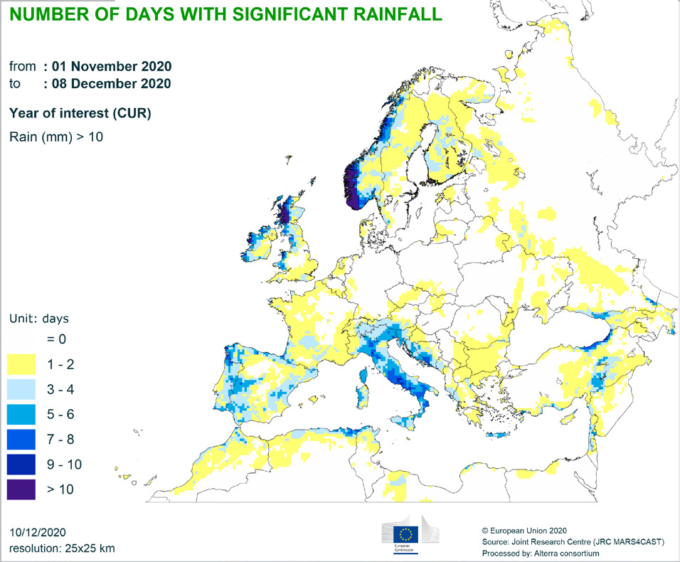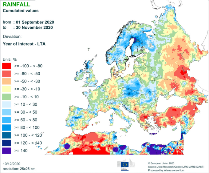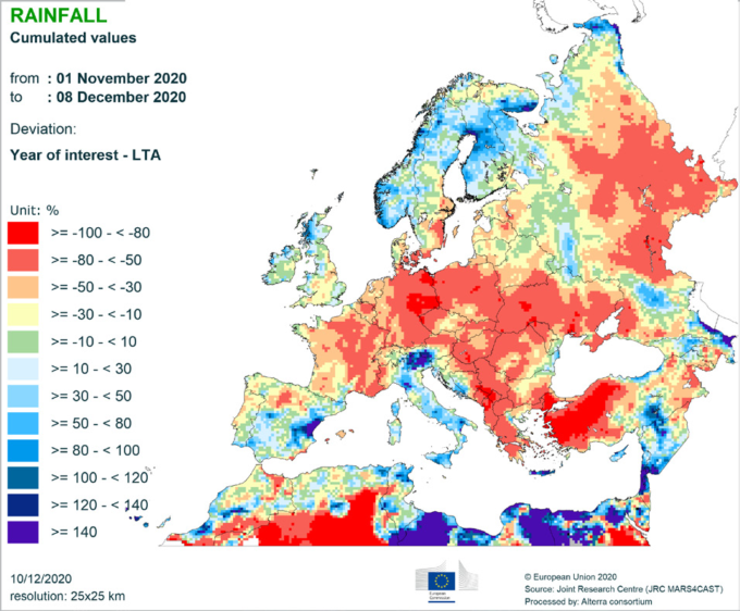 В значительных частях Италии, южной Испании, Швеции и Финляндии условия было заметно более влажными, чем обычно. Напротив, более сухие, чем обычно, условия были зарегистрированы в большинстве стран Центральной, Восточной и Юго-Восточной Европы; наиболее заметно — в восточной Германии, Польше, южной Украине, северной Румынии и Турции. Эти погодные условия позволили завершить посев озимых культур в регионах, где посев оставался отложенным (Восточная Чехия, Словакия, Венгрия, Болгария и Румыния), по данным ноябрьского выпуска Бюллетеня, хотя и не везде в пределах оптимального временного окна.