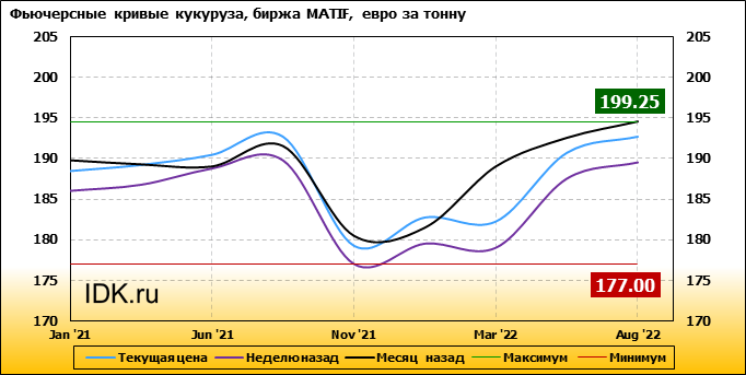 На 14.12.2020 стоимость кукурузы на бирже MATIF по контракту Jan ’21 составила 188.5 евро за тонну. За прошедшую неделю стоимость кукурузы на европейской площадке выросла на 2.5 евро/тонна. Как мы видим на графике, фьючерсная кривая имеет периоды, когда более дальний фьючерс дешевле ближнего. Состояние бэквардации наблюдаем на следующих контрактах: Nov ’21. Таким образом, трейдеры предполагают, что возможно превалирование предложения над спросом в указанные периоды.