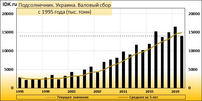 Согласно декабрьскому отчету WASDE, производство подсолнечника в Украине в 2020/21 году оценивается в 14,0 млн. метрических тонн, без изменений по сравнению с прогнозом прошлого месяца, и на 2,50 млн. тонн или 15 процентов меньше, чем в прошлом году. Урожайность, как и в ноябре, оценивается в 2,06 тонны с гектара, что на 20 процентов меньше, чем в прошлом году. Уборочная площадь оценивается в 6,8 миллиона гектаров, без изменений по сравнению с прошлым месяцем и на 6 процентов больше, чем в прошлом году.