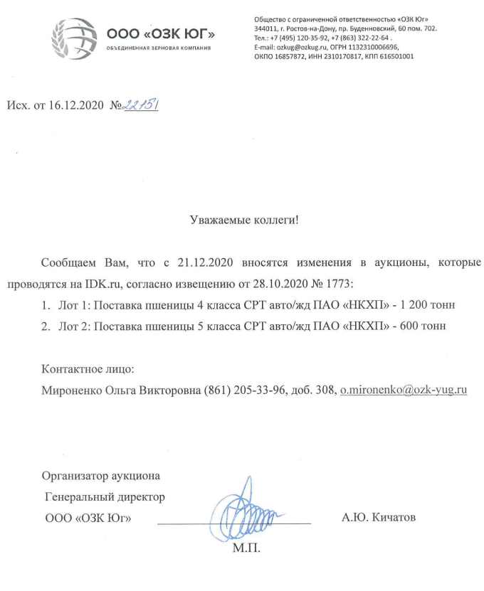ООО «ОЗК Юг» с 21-го декабря вносит изменения в аукционы, которые проводятся на электронной торговой площадке IDK.ru по закупке пшеницы согласно извещения № 1773 от 28.10.2020 г.: