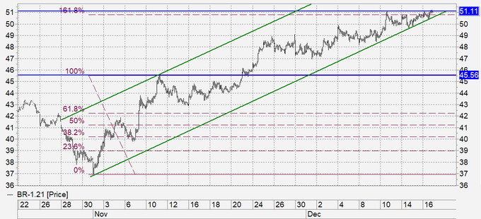 EIA отрапортовало о падении запасов нефти за неделю в США на 3.135 млн. баррелей. Увидев падение запасов, рынок поставил новый локальный максимум. Утром в Азии цены продолжают восхождение и достигли отметки 51.65 долларов за баррель. В текущих обстоятельствах мы вправе рассчитывать на откат к 51.00, но более сильное падение пока не просматривается.
