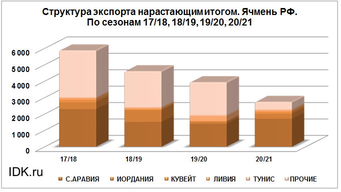 Структура экспорта ячменя из России нарастающим итогом по сезонам