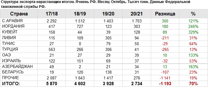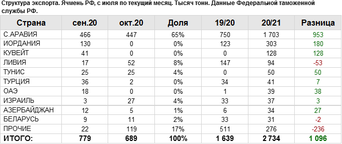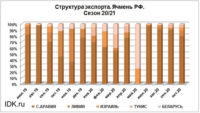 Объем поставок ячменя на экспорт за период с июля 2020 года по октябрь 2020 года в Саудовскую Аравию составил 1702.92 тыс. тонн, что на 953.25 тыс. тонн больше объема поставок в данную страну в прошлом сезоне на тот же отчетный месяц.