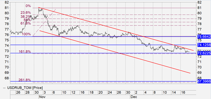 Видим, что мартовский фьючерс более агрессивен нежели USD/RUB ТОМ. Цены проходили ниже важного уровня поддержки 73500, но пока не смогли закрепиться. В принципе, пресс-конференция президента закончилась. Картинка была нарисована. Можно и откатить вверх.
