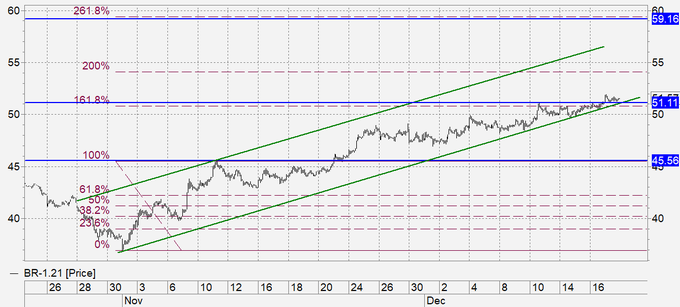 Быки очень хотят усидеть в растущем ценовом канале, но время у них на исходе. Если цены сегодня уйдут ниже 50.50, это приведет к падению в район 49.00, а если учитывать ширину восходящего канала (6.00 долларов), то мы можем рассчитывать на ход к 44.50.