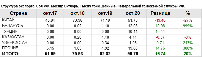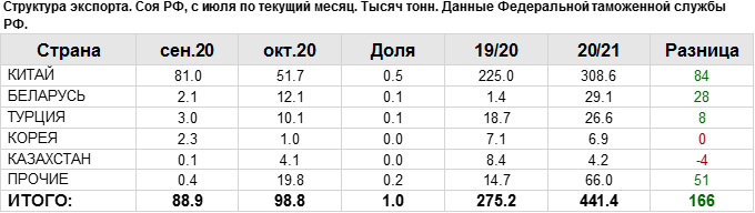 Объем поставок сои на экспорт за период с июля 2020 года по октябрь 2020 года в Китай составил 308.61 тыс. тонн, что на 83.63 тыс. тонн больше объема поставок в данную страну в прошлом сезоне на тот же отчетный месяц.