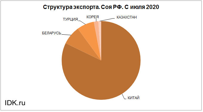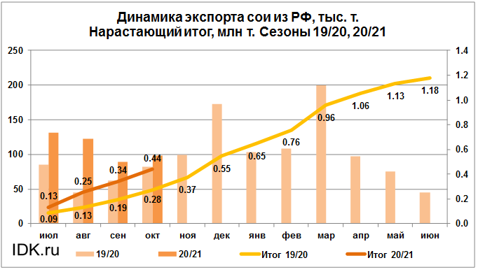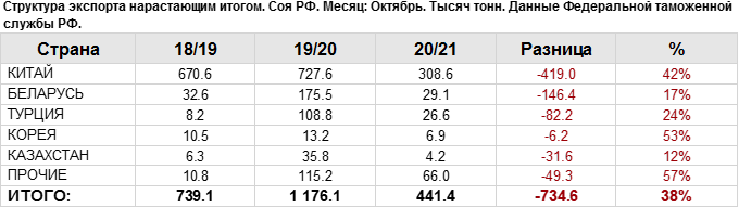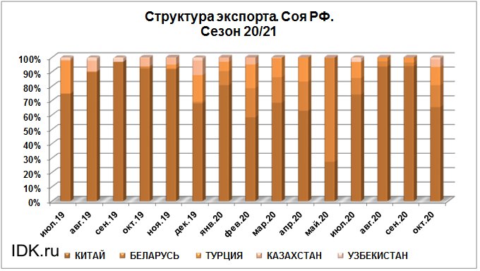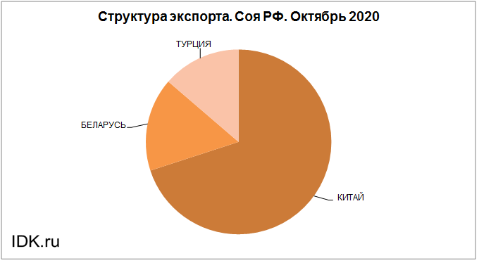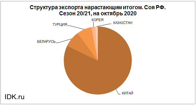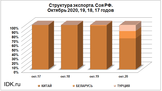 Объем поставок сои на экспорт за период с июля 2020 года по октябрь 2020 года в Беларусь составил 29.11 тыс. тонн, что на 27.66 тыс. тонн больше объема поставок в данную страну в прошлом сезоне на тот же отчетный месяц.
