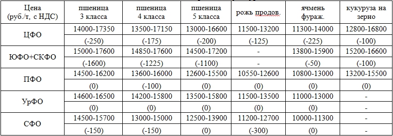 На текущей неделе в зернопроизводящих регионах наблюдалось преимущественное снижение ценовых показателей на зерновые культуры. При этом если в Поволжье и на Урале отмечалась относительная стабилизация цен, то в центральной части страны и на Юге стоимость зерна активно уменьшалась.