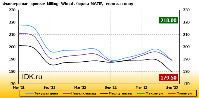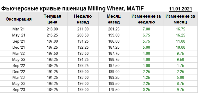 На 11.01.2021 стоимость пшеницы Milling Wheat на бирже MATIF по контракту Mar ’21 составила 218 евро за тонну. За прошедшую неделю стоимость пшеницы Milling Wheat выросла на 7 евро/тонна. Как мы видим на графике, фьючерсная кривая имеет периоды, когда более дальний фьючерс дешевле ближнего. Состояние бэквардации наблюдаем на следующих контрактах: May ’21; Sep ’21; Sep ’22; Sep ’23. Таким образом, трейдеры предполагают, что возможно превалирование предложения над спросом в указанные периоды.