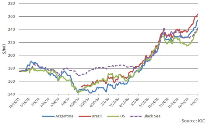 С момента публикации декабрьского WASDE, основные экспортные цены кукурузы выросли, что, вероятно, было связано с ростом цен на сою и опасениями по поводу предложения в Южной Америке. Цены в Аргентине выросли на 27 долларов за тонну до 254 долларов, а бразильские цены — на 29 долларов за тонну до 264 долларов на фоне ограниченных запасов, ожидаемых в ближайшее время. Цены в Причерноморье выросли на 17 долларов за тонну до 244 долларов из-за высокого спроса со стороны Китая. Цены в США выросли на 22 доллара за тонну до 240 долларов за счет активных продаж и поставок. Цены в США остаются самыми низкими среди основных экспортеров.