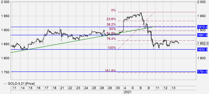 Быки не могут расшевелить рынок. Склонность к продолжению падения сохраняется. Здесь надо стоять в шортах, наращивая позицию по мере роста к 1910. Инаугурация Байдена должна свести политические риски на нет. Отметим, что фото солдат национальной гвардии США, спящие внутри Капитолия, производит впечатление.
