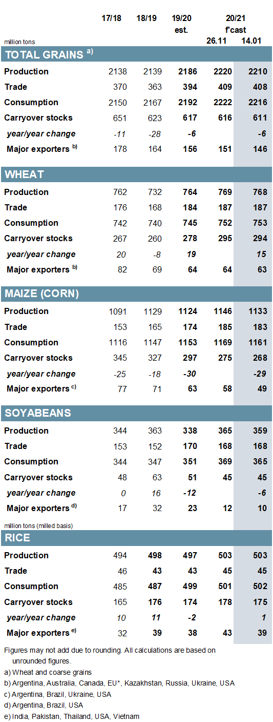 Прогноз мирового производства зерновых культур (пшеница и фуражное зерно) на 2020/21 год снижен на 9 млн. тонн по сравнению с прошлым месяцем до 2 210 млн. тонн, поскольку значительное сокращение для кукурузы (в основном для США, Аргентины и Бразилии) лишь частично компенсируется увеличением для пшеницы (в том числе для Австралии, Канады и России) и ячменя (Аргентина, Канада). Прогноз потребления зерна снижен на 5 млн. тонн до 2 216 млн. тонн, при этом снижение для кормового и промышленного потребления кукурузы превосходит небольшое увеличение для других кормовых культур и пшеницы. В основном в связи с корректировкой в сторону понижения для кукурузы, прогноз по остаткам всех зерновых на конец 2020/21 года снижен на 5 млн. тонн до 611 млн. тонн, что представляет собой сокращение на 6 млн. по сравнению с прошлым годом. Прогноз торговли (июль / июнь) сокращен до 408 млн. тонн, так как увеличение прогнозов по поставкам пшеницы, ячменя, сорго и овса не полностью компенсируют сокращение поставок кукурузы.