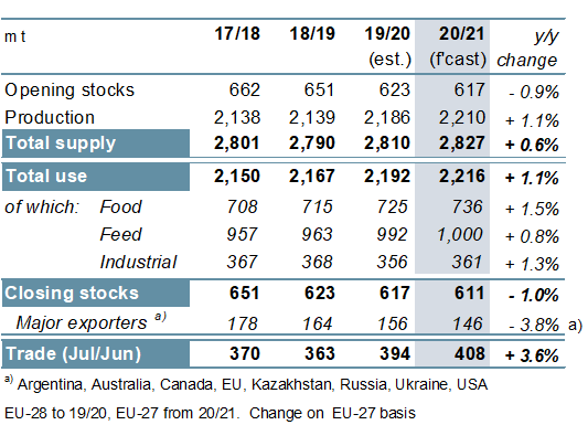 Согласно прогнозу, совокупное мировое производство зерновых культур (пшеница и фуражное зерно) в 2020/21 году вырастет на 23 млн. тонн по сравнению с прошлым годом до рекордного уровня в 2 210 млн., включая рекордные урожаи пшеницы и ячменя. Хотя пандемия COVID продолжает сдерживать спрос в некоторых секторах, особенно на топливный этанол и пивоварение, прогнозируется, что общее потребление вырастет пятый год подряд до 2 216 млн. тонн (+ 24 млн. год к году). Это включает прирост на 8 млн. тонн для кукурузы и пшеницы и на 2 млн. тонн для ячменя, сорго и овса. Ожидается очередное сокращение мировых остатков зерна до пятилетнего минимума в 611 млн. тонн (-6 млн. год к году). Это снижение полностью обусловлено падением остатков кукурузы до восьмилетнего минимума, вызванным сокращением в США, Китае и ЕС. Напротив, остатки пшеницы могут вырасти до нового максимума, хотя рост ожидается в основном в Китае и Индии, в то время как совокупный объем переходящих остатков пшеницы основных экспортеров, как ожидается, мало изменится по сравнению с прошлым годом. Мировые остатки ячменя ожидаются на максимальном уровне за 11 сезонов, отчасти из-за резкого роста в Австралии после обильного урожая. С учетом значительного увеличения поставок пшеницы, кукурузы и сорго ожидается, что мировая торговля зерном в 2020/21 году (июль / июнь) достигнет рекордных 408 млн. тонн, что представляет собой рост на 4% год к году.