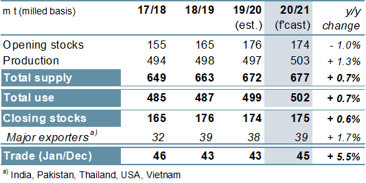 Прогноз мирового производства риса в 2020/21 году практически не изменился по сравнению с предыдущим и находится на уровне 503 млн. тонн, но из-за более низкого показателя начальных остатков общие запасы сокращены на 2 млн. по сравнению с прошлым месяцем. Поскольку потребление повышено до нового максимума, мировые переходящие остатки снижены до 175 млн. тонн (+1 млн. год к году), при этом большая часть понижательных корректировок относится к крупным экспортерам, в частности Индии. На уровне 45 млн. тонн прогноз торговли в 2021 году практически не изменился и представляет собой небольшой рост по сравнению с предыдущим годом.