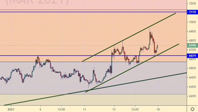 Главный вопрос недели: пойдем к 710.0 или нет. Если рынок начнет в ускоренном темпе выписывать авансы доллару и ставить на его укрепление, то хода к 710.0 можем так и не увидеть. В текущей ситуации уровень 660.0 становится триггером. Пока мы выше него, разумнее держать лонги. В противном случае придется уходить из длинных позиций.