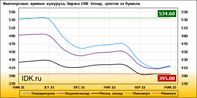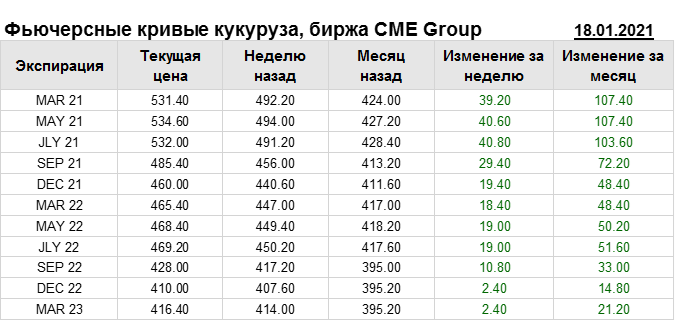 На 18.01.2021 стоимость кукурузы на бирже CME Group по контракту MAR 21 составила 531.4 центов за бушель. За прошедшую неделю стоимость кукурузы на площадке CME Group выросла на 39.2 цента/бушель. Как мы видим на графике, фьючерсная кривая имеет периоды, когда более дальний фьючерс дешевле ближнего. Состояние бэквардации наблюдаем на следующих контрактах: JLY 21; SEP 21; DEC 21; SEP 22; DEC 22. Таким образом, трейдеры предполагают, что возможно превалирование предложения над спросом в указанные периоды.
