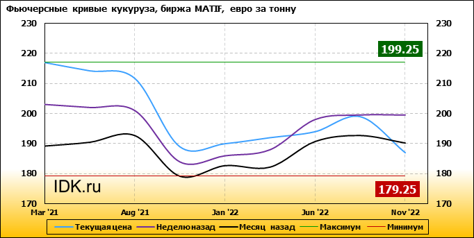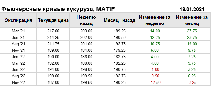 На 18.01.2021 стоимость кукурузы на бирже MATIF по контракту Mar ’21 составила 217 евро за тонну. За прошедшую неделю стоимость кукурузы на европейской площадке выросла на 14 евро/тонна. Как мы видим на графике, фьючерсная кривая имеет периоды, когда более дальний фьючерс дешевле ближнего. Состояние бэквардации наблюдаем на следующих контрактах: Jun ’21; Aug ’21; Nov ’21; Nov ’22. Таким образом, трейдеры предполагают, что возможно превалирование предложения над спросом в указанные периоды.