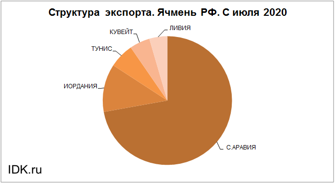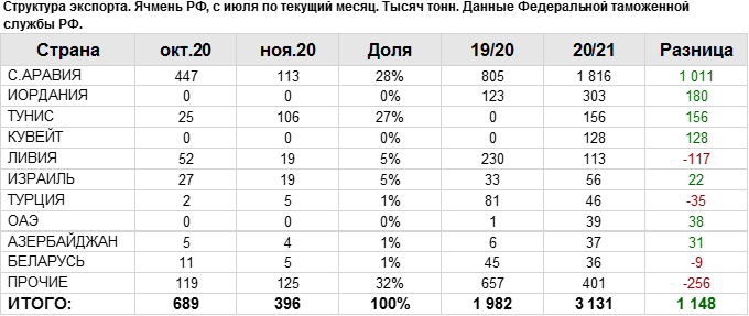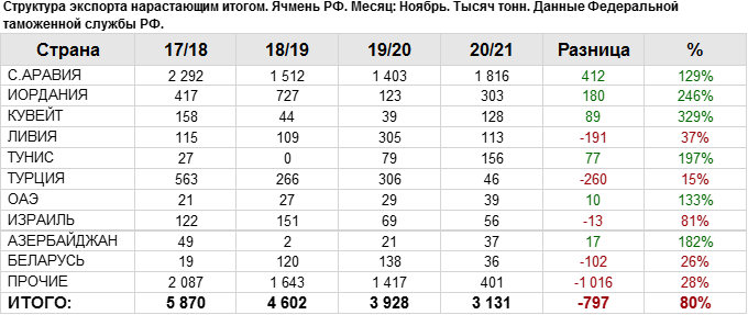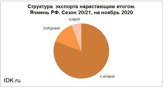 Объем поставок ячменя на экспорт за период с июля 2020 года по ноябрь 2020 года в Саудовскую Аравию составил 1815.7 тыс. тонн, что на 1010.98 тыс. тонн больше объема поставок в данную страну в прошлом сезоне на тот же отчетный месяц.