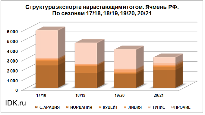 Структура экспорта ячменя из России нарастающим итогом по сезонам
