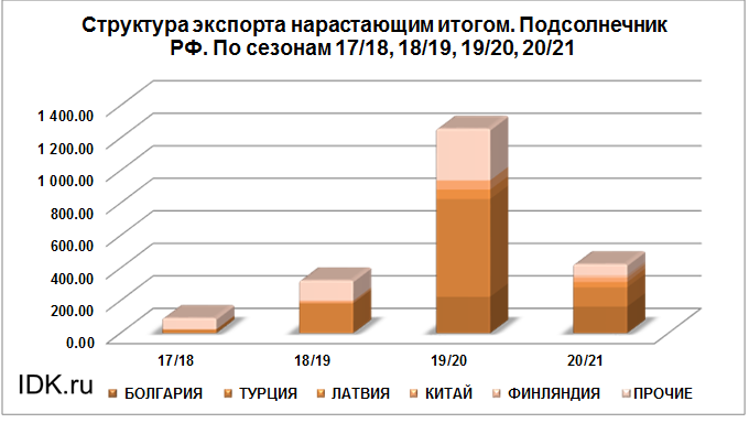 Структура экспорта подсолнечника из России нарастающим итогом по сезонам