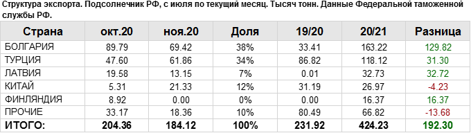 Объем поставок подсолнечника на экспорт за период с июля 2020 года по ноябрь 2020 года в Болгарию составил 163.22 тыс. тонн, что на 129.82 тыс. тонн больше объема поставок в данную страну в прошлом сезоне на тот же отчетный месяц.
