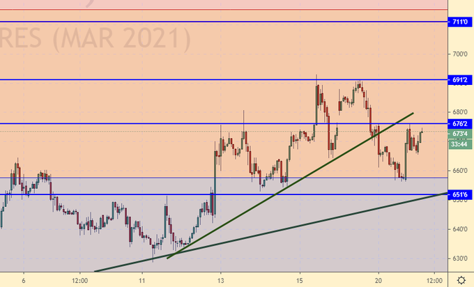 Слухи о том, что правительству США придется выпускать облигации в триллионных объемах, чтобы ФРС под них давало ему деньги, не дают золоту пасть. Впрочем, трезвые речи команды Байдена могут несколько охладить пыл быков. Ход к 1750 остается возможным.