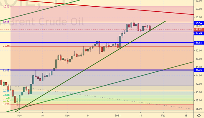 Сценарий роста: видим выход из консолидации вверх. В понедельник может быть гэп опять же вверх на 30 – 50 копеек из-за нервной обстановки по поводу Навального. Европа требует освободить его из-под стражи и грозит санкциями. Отметим и позитив, желание американцев продлить договор по СНВ на пять лет, как и предлагал Кремль, говорит о том, что не все каналы общения с Вашингтоном закрыты.