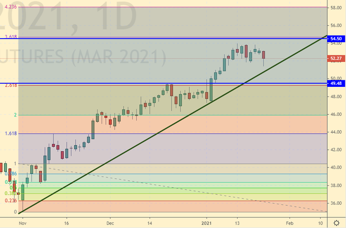 Продажа: после падения ниже 52.00. Стоп: 53.86. Цель: 46.00. Кто в позиции от 52.40, перенесите стоп на 53.86. Цель: 46.00.