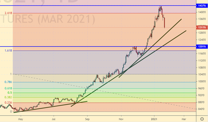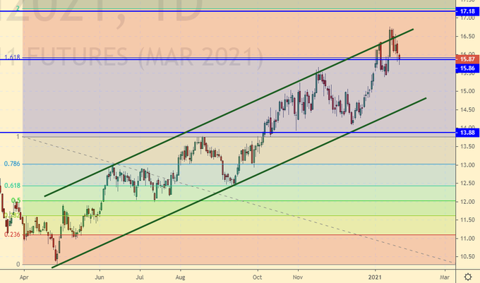 Сценарий роста: рассматриваем мартовский фьючерс, дата экспирации 26 февраля. В текущих обстоятельствах будем ждать откат к 14.00. Текущие уровни высоки. Отметим, что до цели на 17.18 мы пока не дошли.