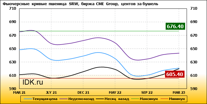 На 25.01.2021 стоимость пшеницы SRW на бирже CME Group по контракту MAR 21 составила 648.4 цента за бушель. За прошедшую неделю стоимость пшеницы SRW упала на 27 цента/бушель. Как мы видим на графике, фьючерсная кривая имеет периоды, когда более дальний фьючерс дешевле ближнего. Состояние бэквардации наблюдаем на следующих контрактах: JLY 21; MAY 22; JLY 22; SEP 22. Таким образом, трейдеры предполагают, что возможно превалирование предложения над спросом в указанные периоды.
