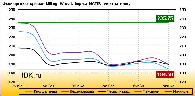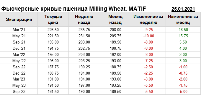 На 25.01.2021 стоимость пшеницы Milling Wheat на бирже MATIF по контракту Mar ’21 составила 226.5 евро за тонну. За прошедшую неделю стоимость пшеницы Milling Wheat упала на 9.25 евро/тонна. Как мы видим на графике, фьючерсная кривая имеет периоды, когда более дальний фьючерс дешевле ближнего. Состояние бэквардации наблюдаем на следующих контрактах: May ’21; Sep ’21; Dec ’21; Sep ’22; Sep ’23. Таким образом, трейдеры предполагают, что возможно превалирование предложения над спросом в указанные периоды.