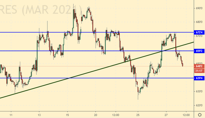 ФРС США оставила ставку на прежнем уровне 0,25%. Комментарий по текущему состоянию дел в экономике был в целом нейтральным. Скорость восстановления Пауэлл привязал к ситуации с вакцинацией. Дела с прививками пока обстоят неважно, о чем говорил и Байден. Процесс нужно ускорять. А пока ФРС продолжит выкуп активов на 120 млрд. долларов в месяц дабы помочь экономике выйти из кризиса. Показатели безработицы остаются высокими. Слово «инфляция» прозвучало, но лишь в контексте, что её, мол, ждут, а её всё нет, хотя уже вот-вот, но это мы дописываем за Пауэлла. Он то попытался донести мысль об инфляции до нас между строк. Мол, кто в теме, тот поймет, упомянув лишь о её целевых уровнях. Но мы то видим рост оптовых цен на протяжении шести месяцев подряд. Скоро эти цены будут и в рознице. На фоне упоминания о целевых уровнях по инфляции, товарные рынки синхронно перешли к снижению.