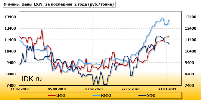 Внутренние цены на ячмень в Уральском федеральном округе упали на 167 руб./т. и на данный момент составляют 11063 рубля за тонну.