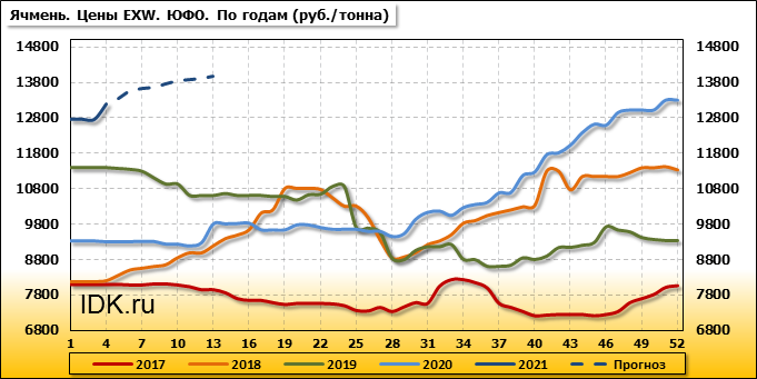 В Южном федеральном округе внутренние цены на ячмень выросли на 433 руб./т. и на данный момент составляют 13189 рублей за тонну.