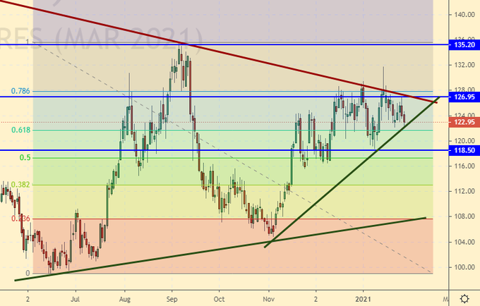 Сценарий роста: рассматриваем мартовский фьючерс, дата экспирации 19 марта. Рынок способен вернуться к 115.0. Ситуация созрела для того, чтобы разродиться пробоем поддержки. Не покупаем. Если будет рост выше 128.00, думать о покупках.