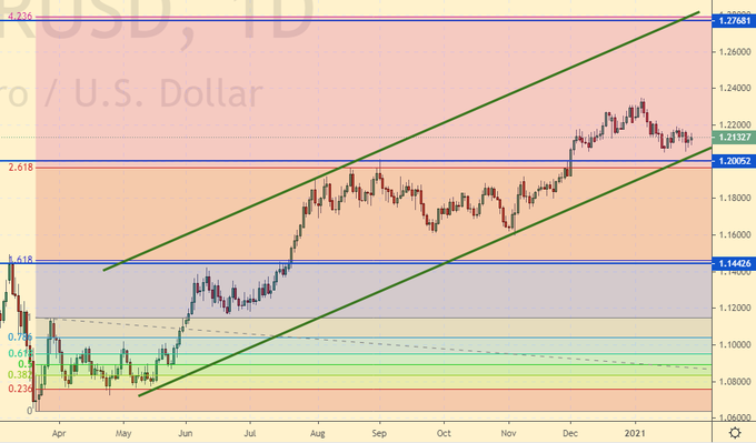 Сценарий роста: неведомый кто-то обороняет уровень 1.2100 и пока успешно. Даже если мы сходим к 1.2700, что не факт, нас ждет падение евро. Еврозона не росла в прошлом году, и вряд ли покажет что-то более 2-х процентов в этом. Америка восстановится быстрее, это стоит осознать.