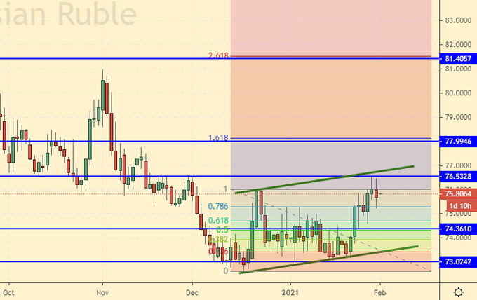 Если нефть перейдет к снижению, то рублю не на что будет опереться, так как нефтегазовые доходы бюджета просели в прошлом году на 34% по сравнению с 2019-м годом, до 5.235 трлн. рублей, а индекс российских долговых бумаг, RGBI, продолжает находиться в падающем тренде.