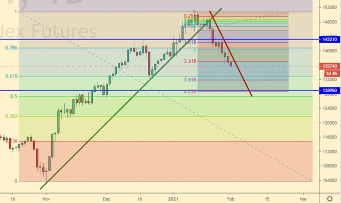 Сценарий падения: кто продал три недели назад, тот держит шорты. Учитывая историю с Reddit, подожмем стоп-ордера. Народ против хедж-фондов – вот это будет противостояние! Картинка-то у нас медвежья, но её могут сломать.