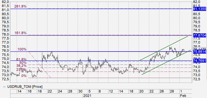 Из-за того, что нефть пробилась выше 56.00, сегодня рубль может получить поддержку. Технически есть предпосылки для снижения рынка к 75.00. В данной ситуации мы вынуждены агрессивно поджать стоп-ордера.