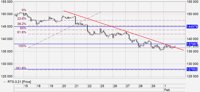 Выросшая за ночь нефть должна дать сегодня импульс для роста индекса РТС. В связи с этим поджимаем стоп ордера. Можно будет купить в случае роста выше 138000, в этом случае у нас сформируется фигура перевернутая «голова плечи», что может привести к росту в район 140000.