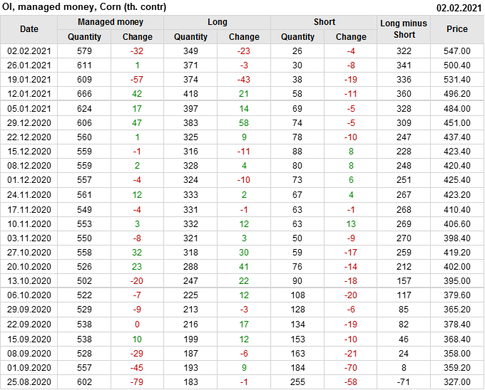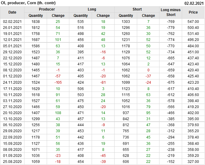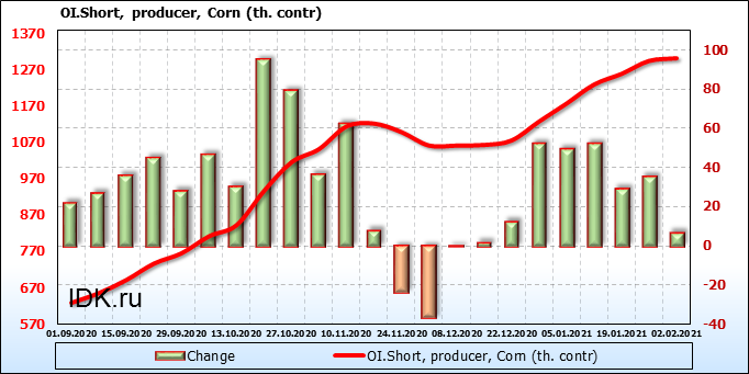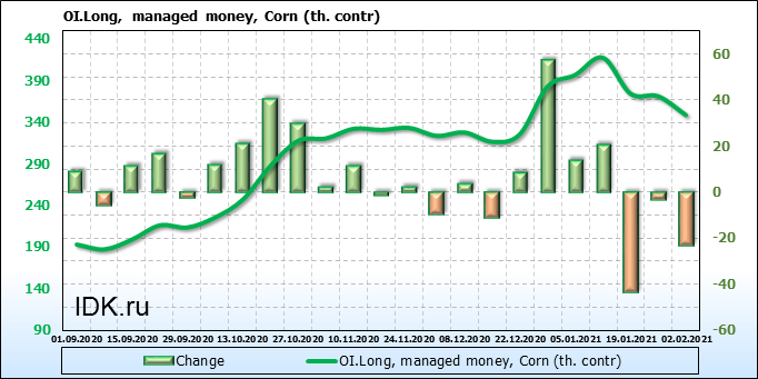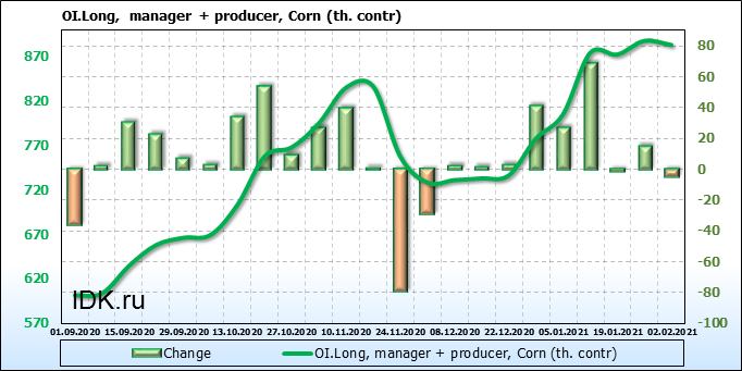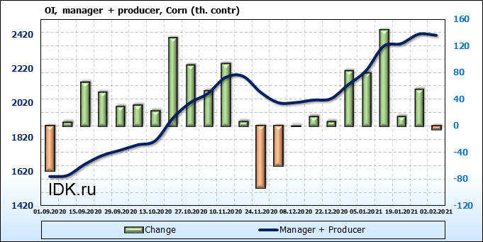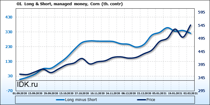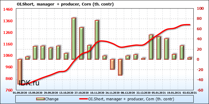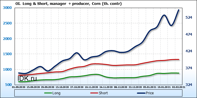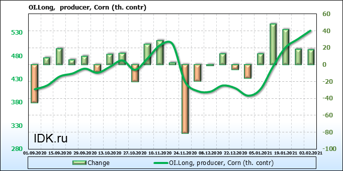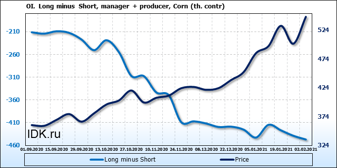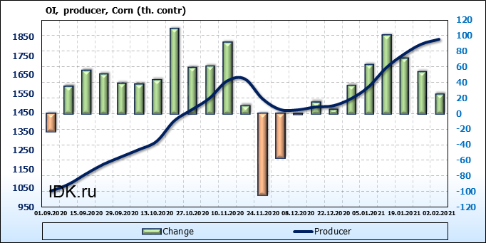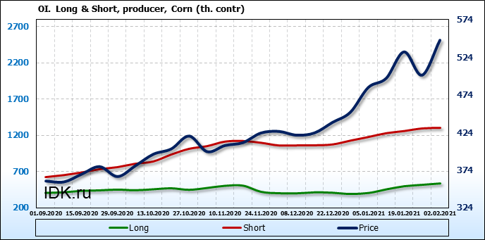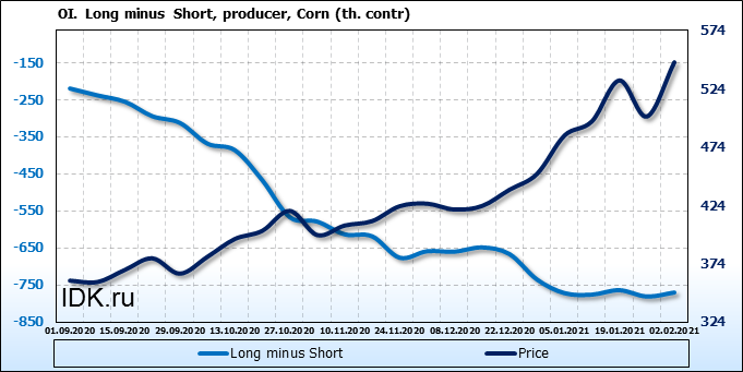 За прошлую неделю, 27.01.21 — 02.02.21, разница между длинными и короткими позициями производителей выросла на 11 тыс. контрактов. В тоже время, цена выросла на 46.6 цента. Производители не торопятся наращивать продажи, предполагая, что возможен рост цены в ближайшее время.