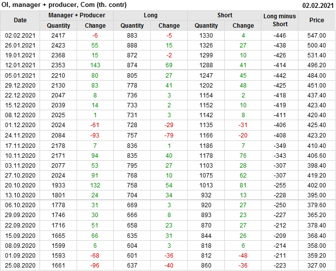 За прошлую неделю, 27.01.21 — 02.02.21, разница между длинными и короткими позициями производителей и управляющих упала на 8 тыс. контрактов. За отчетный период времени, цена выросла на 46.6 цента. Разница совокупного объема длинных и коротких позиций производителей и управляющих на прошедшей неделе снизилась, в то время как цены выросли. Рынок теряет доверие покупателей, что, при продолжении данной динамики, приведет к стабилизации или падению цен в ближайшее время.