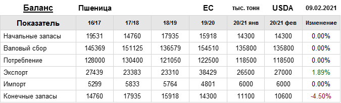 Согласно февральскому прогнозу МСХ США, производство пшеницы в странах ЕС в 2020/21 году составит 135,80 млн. тонн, что на 18,71 млн. тонн (12,11 процентов) меньше, по сравнению с прошлым годом. Аналогичный объем производства прогнозировался в январе. Оценки урожайности и уборочной площади также не изменились по сравнению с прошлым месяцем. Урожайность оценивается в 5,52 тонны с гектара, уборочная площадь — в 24,61 миллиона гектаров. Прогноз по экспорту пшеницы из ЕС в 2020/21 году повышен на 500 тыс. тонн до 27 млн. тонн в связи с повышением конкурентоспособности блока относительно России.