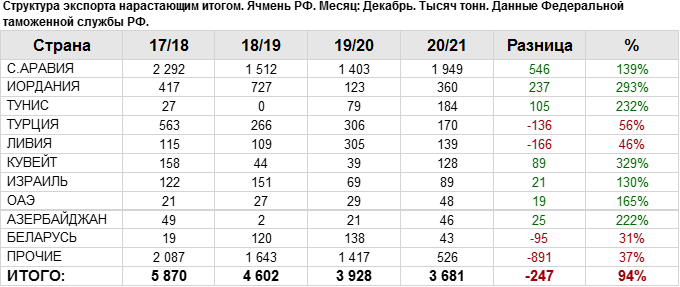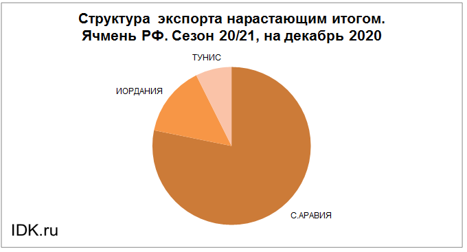 Объем поставок ячменя на экспорт за период с июля 2020 года по декабрь 2020 года в Саудовскую Аравию составил 1949.26 тыс. тонн, что на 1015.27 тыс. тонн больше объема поставок в данную страну в прошлом сезоне на тот же отчетный месяц.