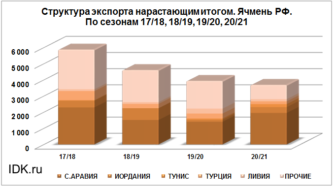 Структура экспорта ячменя из России нарастающим итогом по сезонам