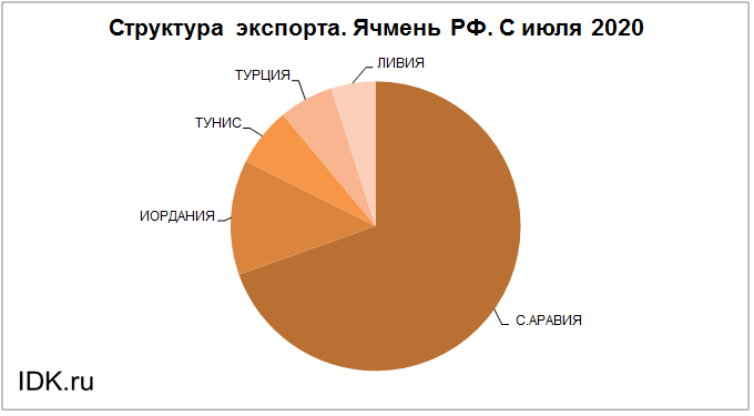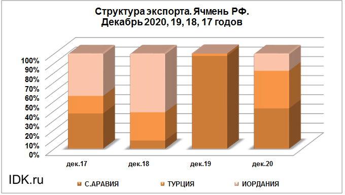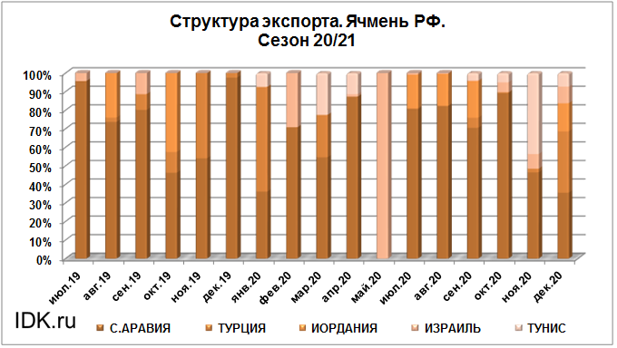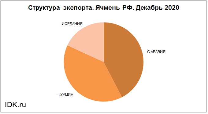Объем поставок ячменя на экспорт за период с июля 2020 года по декабрь 2020 года в Иорданию составил 360.07 тыс. тонн, что на 237.08 тыс. тонн больше объема поставок в данную страну в прошлом сезоне на тот же отчетный месяц.