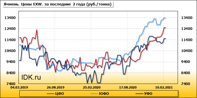 В Южном федеральном округе внутренние цены на ячмень выросли на 156 руб./т. и на данный момент составляют 13397 рублей за тонну.