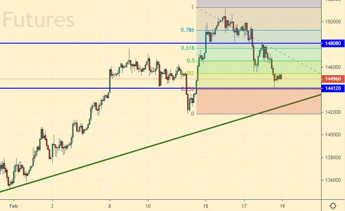У района 144000 возможна борьба. Если рубль будет падать к доллару, то одного «задора» на российском фондовом рынке не хватит. В этом случае падение индекса будет продолжено. Если мы пробьем 141000 вниз, то можно будет говорить о коррекции в район 131000.